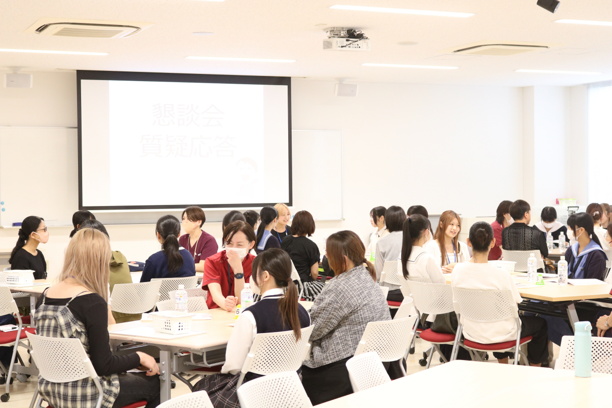懇談会では、小グループに分かれて在学生や教員と意見を交わし、大学生活に関する疑問や不安を共有するなど、和やかな雰囲気の中で活発な交流が行われました。