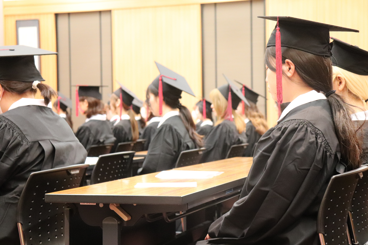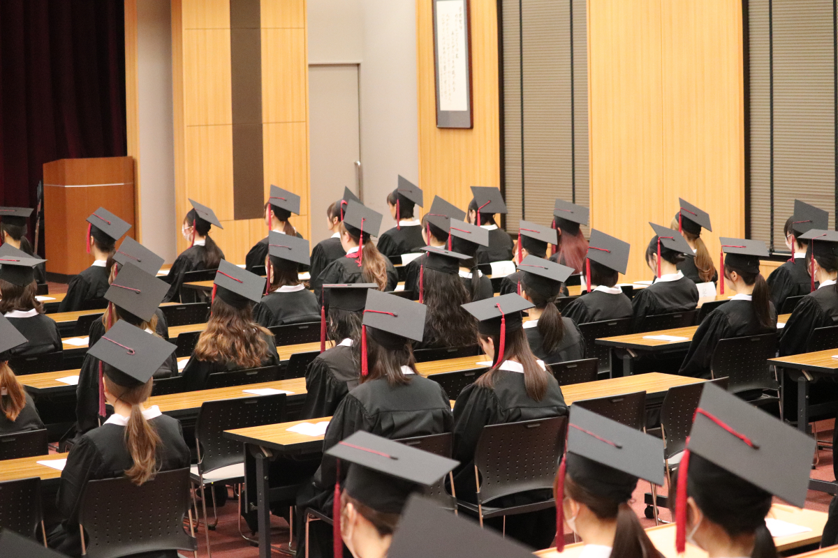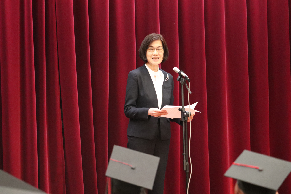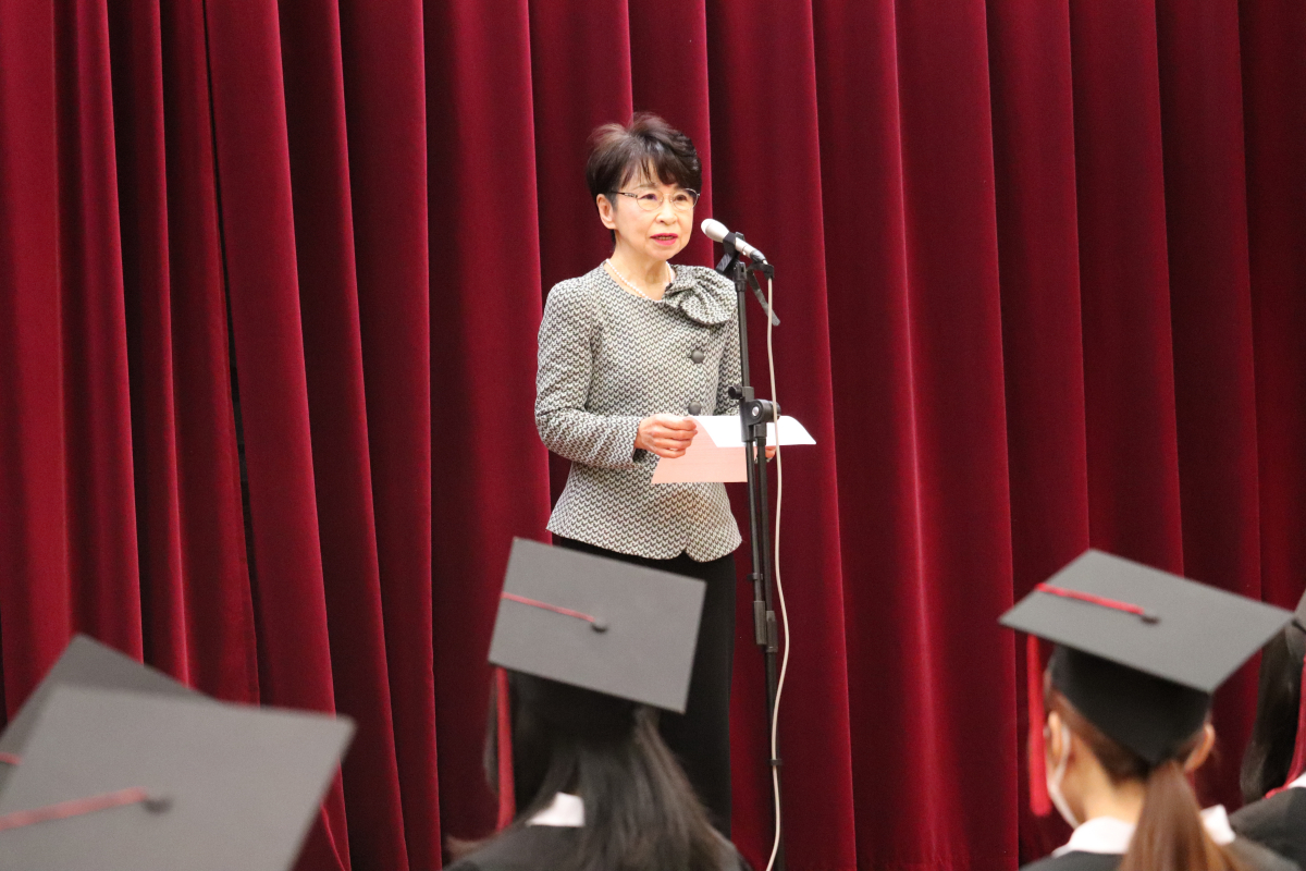卒業と同時に、卒業生の皆さんは福岡女学院同窓会の正会員となります。同窓会会長の野田 幸子様より、卒業した後も、私たちは家族のようにつながっていますという温かい歓迎のお言葉をいただきました。