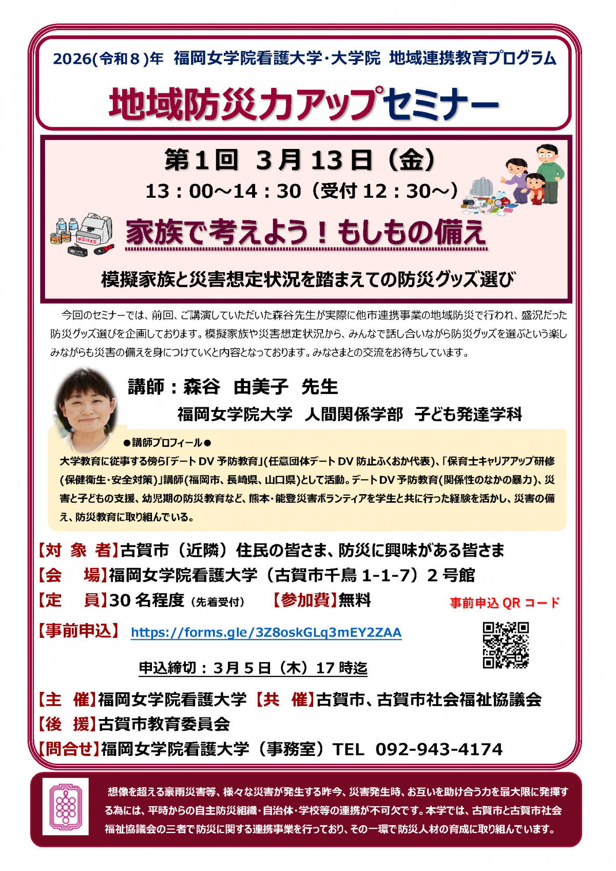 本学では、古賀市と古賀市社会福祉協議会の三者で防災に関する連携事業を行っており、その一環として地域防災力アップセミナーを3月13日(金)に開催します。